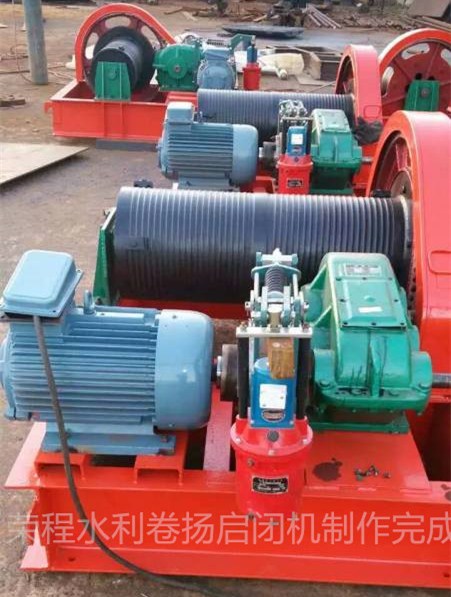 卷揚機通過齒輪箱和減速齒輪減速,減速過程大,速比大。有時它通過滑輪組以擴大比例,從而可以獲得更大的開啟力,這適用于具有較大孔徑和水頭的閘門。鋼絲繩圍繞繩索鼓,一般包圍單層,也可以圍繞多層。因此,提升機的跳閘實際上是無約束的,并且以更大的行程打開閘門或深孔閘門是方便的。鋼絲繩的力方向可以適當擺動,也可以通過附加的埋入式轉向滑輪來改變。因此,閘門與提升機之間的協作非常靈活。在選擇電力時,升降和關閉速度較快,適合于事固閘門和經常開啟的閘門的開閉。